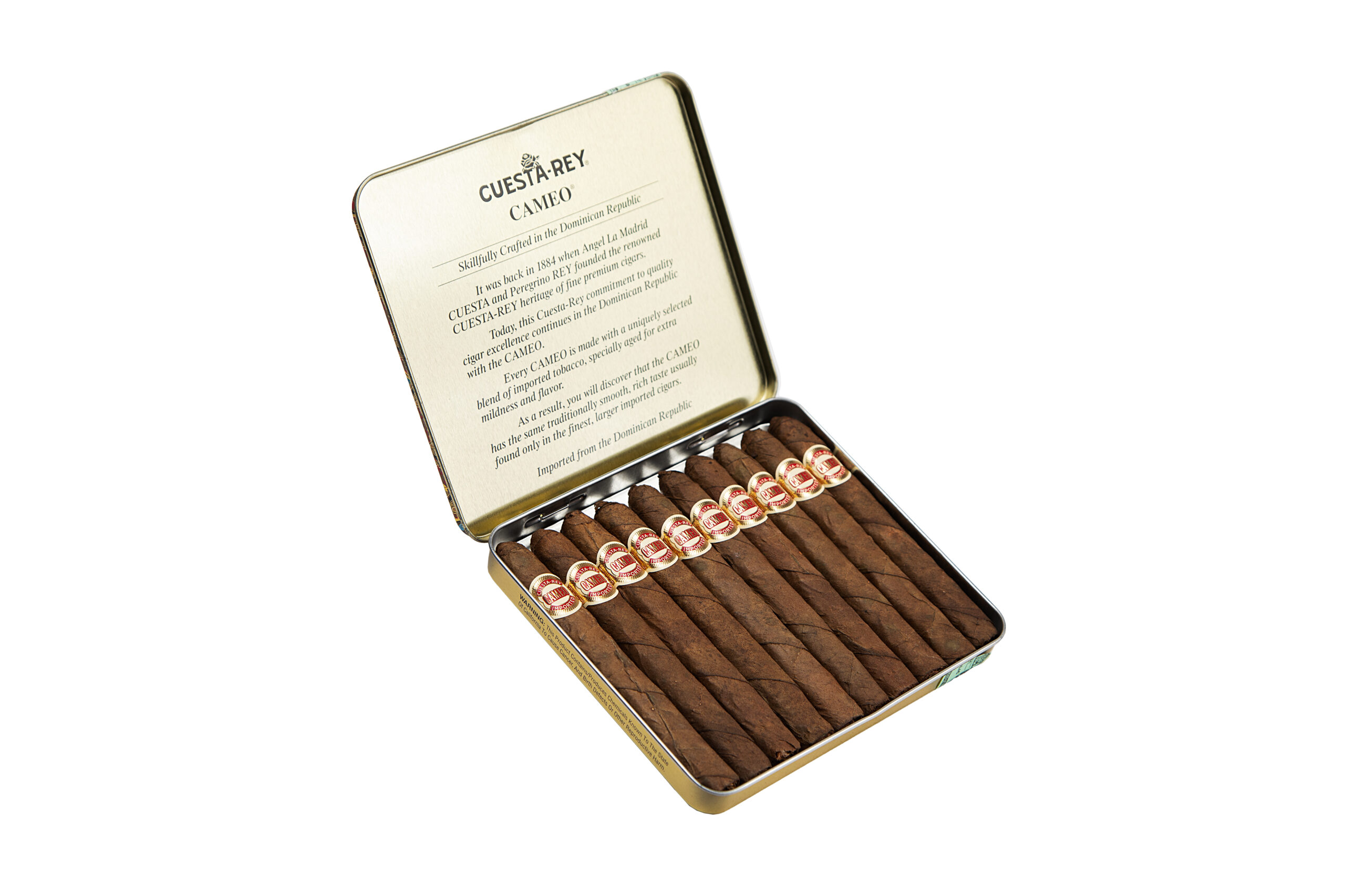 The Arturo Fuente Cuesta-Rey Cameo provides a perfectly crafted, quick, and flavorful mild to medium-bodied smoking experience in a convenient tin. These petite cigars feature the same high-quality Connecticut Shade Natural wrapper found on larger Cuesta-Rey cigars, renowned for its delicate flavor and smooth texture. Inside, a blend of aged Dominican short fillers offers consistent notes of sweet cream, aromatic cedar, and a gentle hint of nuts. Ideal for short breaks, commutes, or when time is limited, the Cameo embodies Fuente’s unwavering commitment to quality and flavor, delivering a satisfying, authentic experience in a convenient, portable tin format.