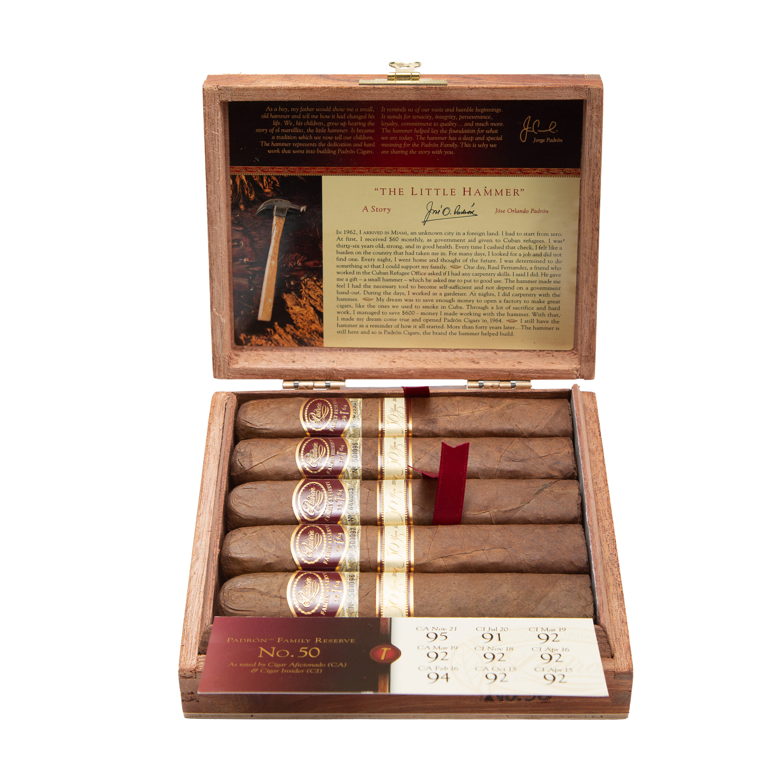 The Padron The Little Hammer No. 50 is an exceptionally rare and highly sought-after full-bodied cigar, meticulously crafted by the renowned Padron family. This impressive 5×50 Robusto vitola is distinctly box-pressed, a signature of many Padron releases, which enhances the smoking experience by concentrating flavors and providing a comfortable grip. It is available in two distinct wrapper options: a rich Nicaraguan Habano (Natural), versions consistently deliver a complex symphony of flavors, including prominent notes of rich cocoa, bold coffee, deep earthiness, and often a lingering sweetness balanced by a touch of spice. Its impeccable construction, a hallmark of Padron, ensures a perfect draw and an exceptionally even burn, culminating in a profoundly rich, complex, and deeply satisfying smoking experience for the discerning collector and aficionado who seeks the pinnacle of Nicaraguan flavor and craftsmanship in a limited-edition offering.